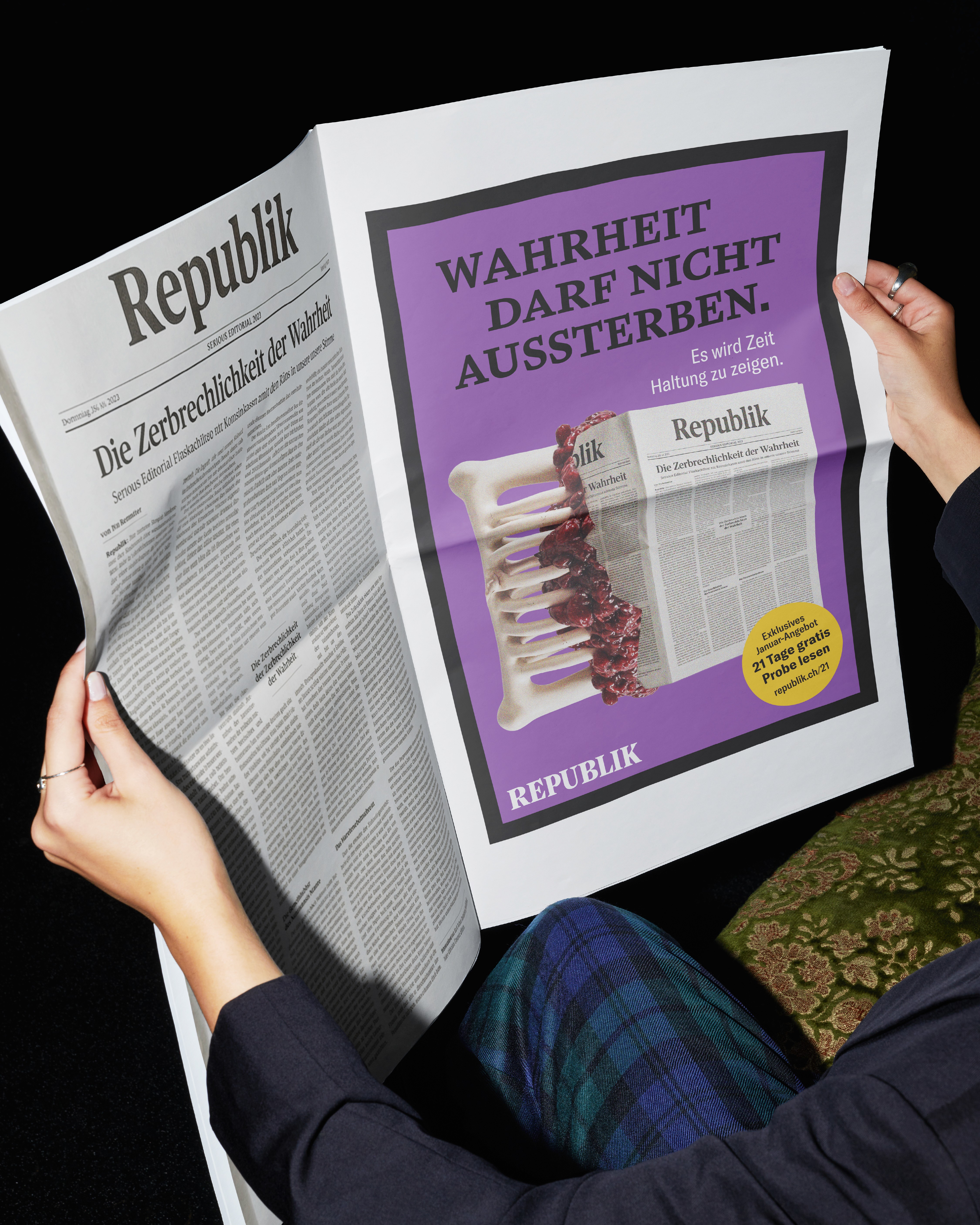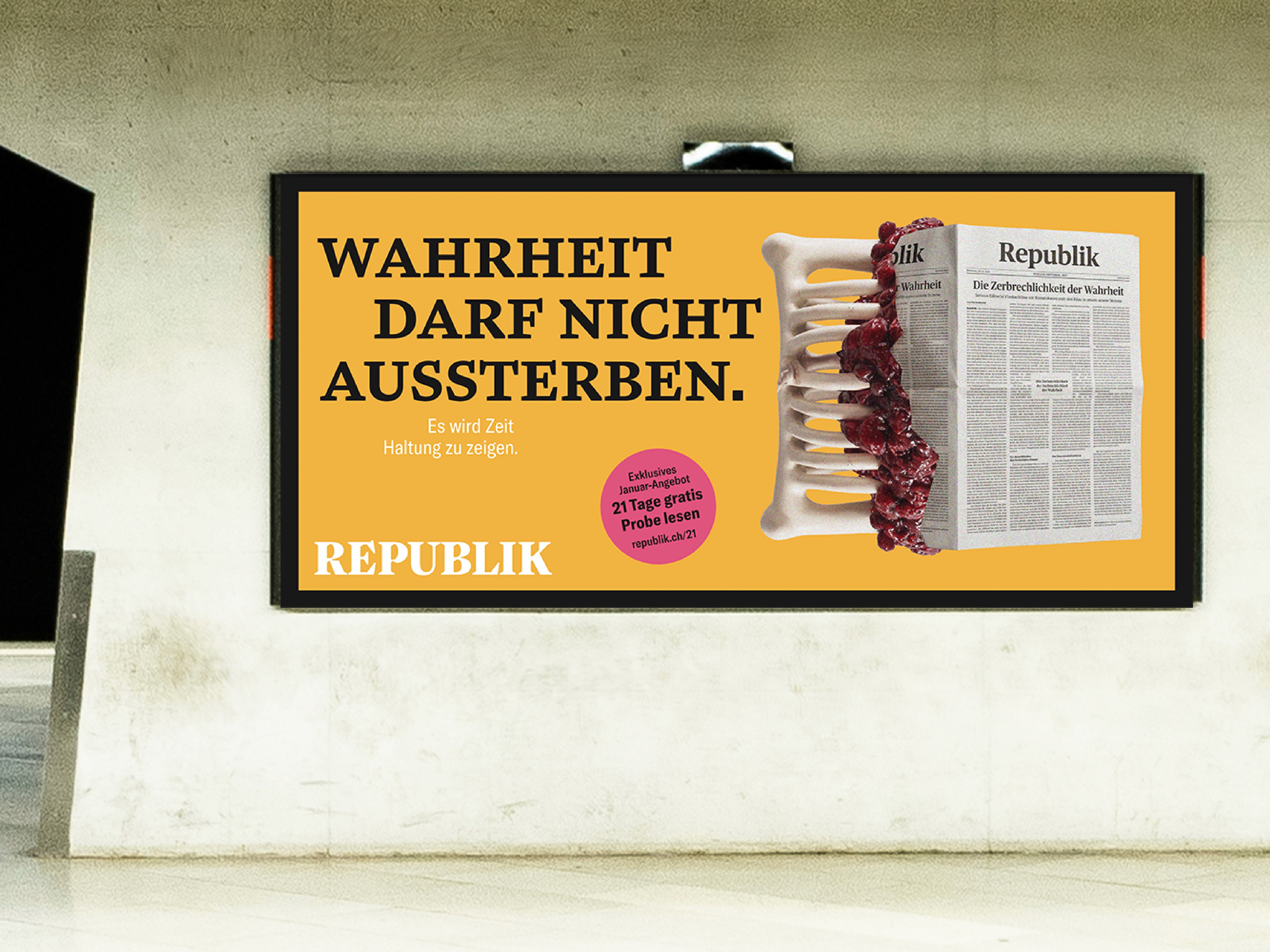 This marketing case study involved designing a suitable campaign on the topic of “Infowar – Information Warfare”. Appropriately, I chose the political magazine Republik as my client and visually packaged a concise, thought-provoking newspaper that looks like it goes extinct, and that we need to fight for the «Truth» in a world full of obsolet informations.