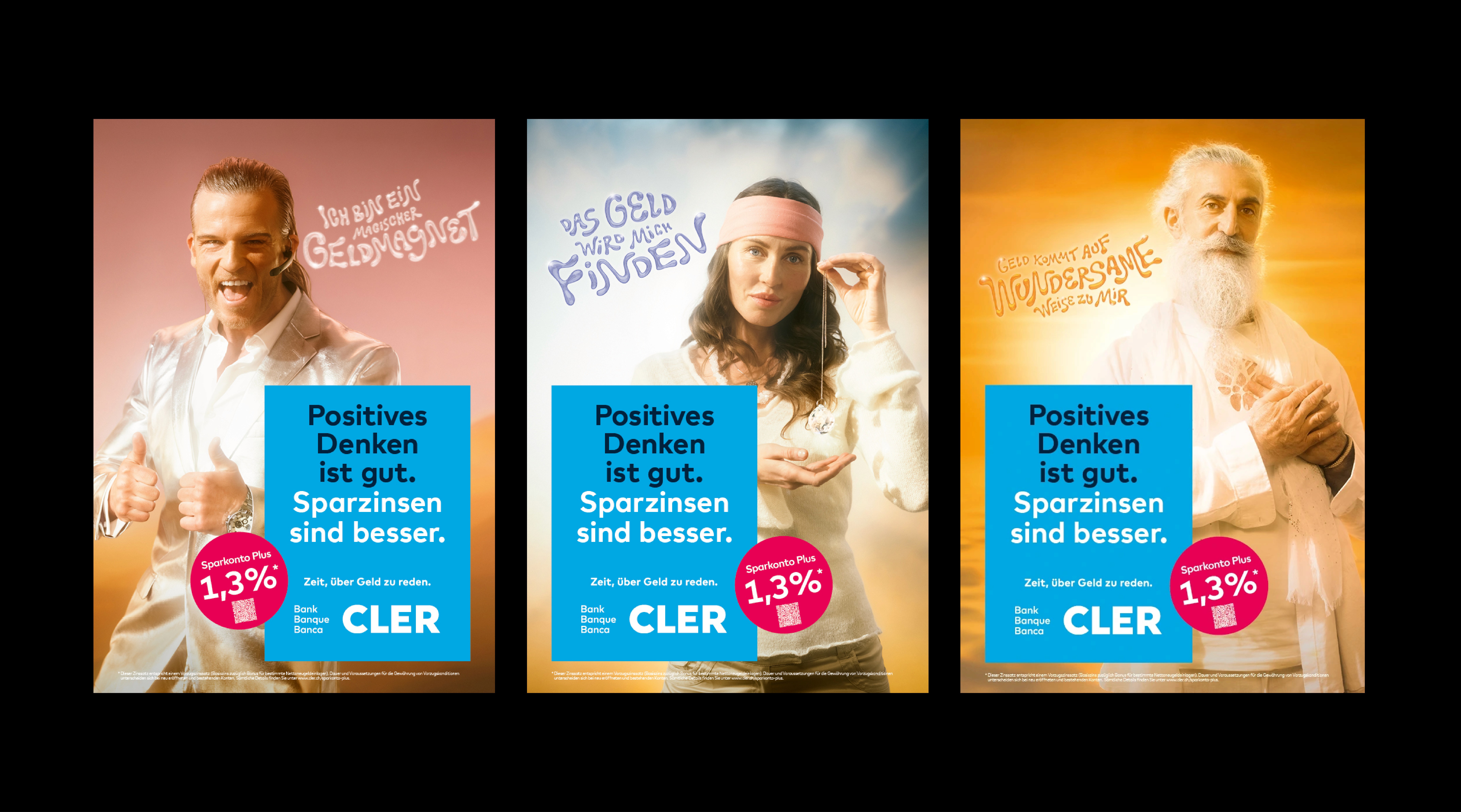 Im Jahr 2023 fand eine nahezu historische Zinswende statt. Anlässlich dieses Ereignisses wurde die Kampagne veröffentlicht und im esoterisch-guruhaften Law of Attraction-Stil verpackt. Dabei hatte ich die Möglichkeit, eine gläserne 3D-Schrift zu gestalten, das Layout der Plakate zu entwerfen und beim Shooting dabei zu sein.